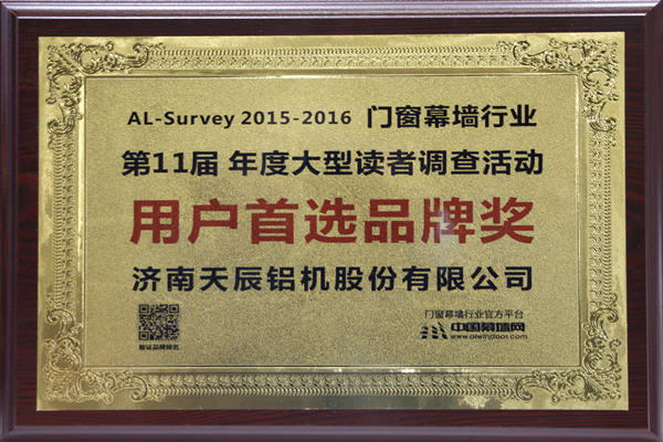 同期,由中國建筑金屬結(jié)構(gòu)協(xié)會(huì)主辦,中國幕墻網(wǎng)承辦的“第十一屆AL-Survey2015-2016中國幕墻網(wǎng)年度大型讀者調(diào)查評(píng)選活動(dòng)”頒獎(jiǎng)儀式在在廣州廣交會(huì)威斯汀酒店隆重舉行,天辰股份榮獲“用戶首選品牌獎(jiǎng)”。